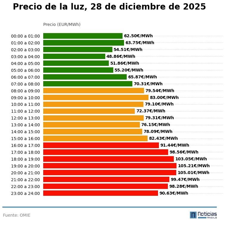 - 18.00 a 19.00: 103,05 €/MWh (0.10305 €/kWh).