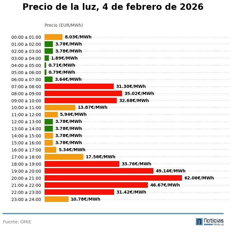 Precio de la luz por horas, miércoles 4 de febrero