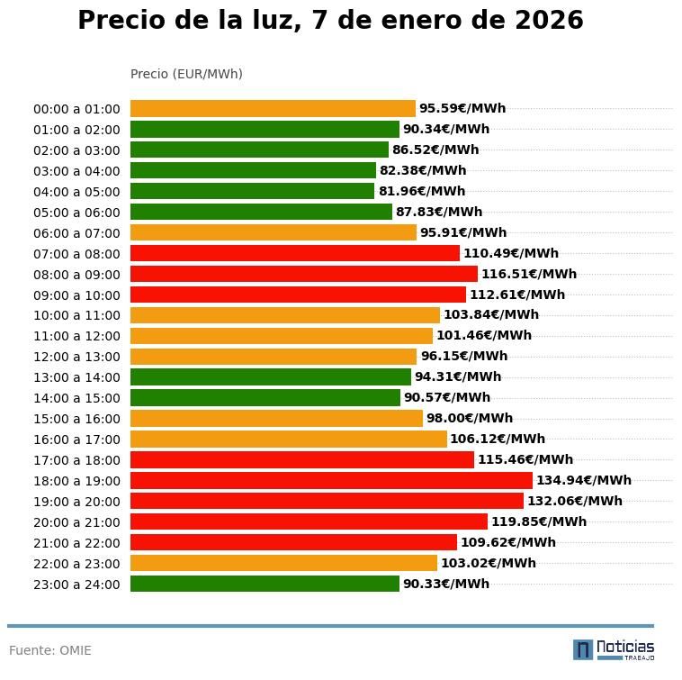 El precio medio de la luz para este miércoles 7 de enero de 2026 se dispara hasta los 102,33 euros el megavatio hora (euros/MWh). En comparación con la tarifa marcada el martes 6 de enero, la electricidad sube un 62,68%, es decir, unos 39,43 euros menos, ya que ese día el precio fue de 62,90 euros/MWh según los datos publicados por el Operador del Mercado Ibérico de la Energía (OMIE).