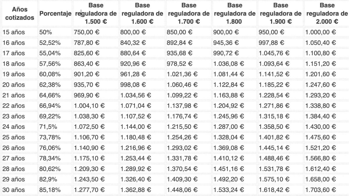 | Años cotizados | Porcentaje | Base reguladora de 1.500 € | Base reguladora de 1.600 € | Base reguladora de 1.700 € | Base reguladora de 1.800 | Base reguladora de 1.900 € | Base reguladora de 2.000 € |