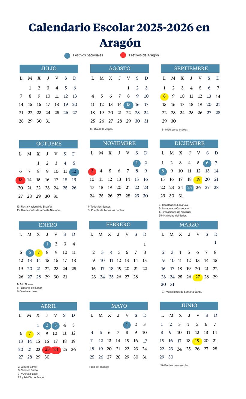 - Zaragoza: viernes 10 de octubre de 2025, lunes 3 de noviembre de 2025 y viernes 6 de marzo de 2026, viernes 24 de abril de 2026 no hay clase.