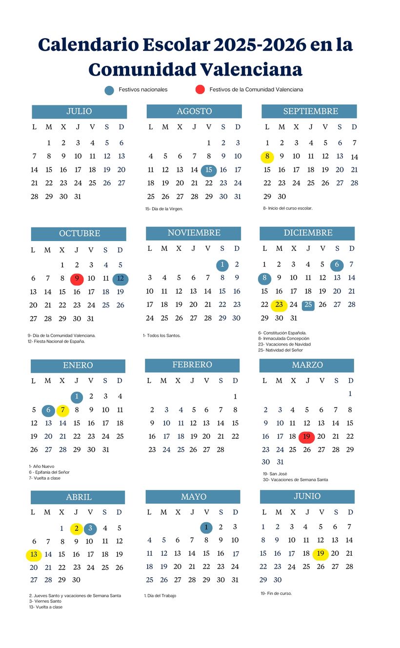 El calendario escolar 2025-2026 cuenta con los siguientes festivos en la Comunidad de Valencia, junto con los nacionales.