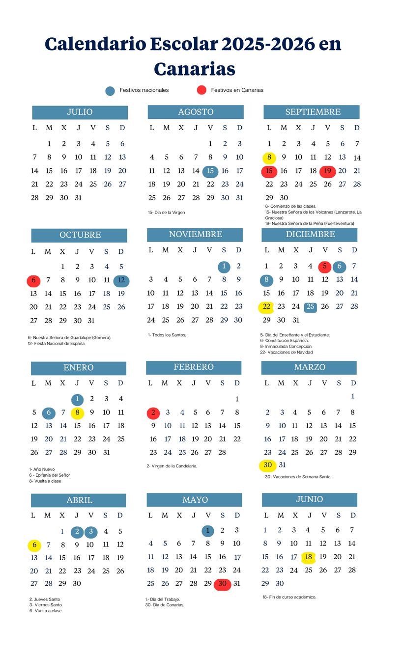 Además de los puentes por festivos nacionales, en otras islas los alumnos tendrán sus días propios no lectivos. Los alumnos de La Graciosa y Lanzarote tendrán puente los días 13 y 15 de septiembre con motivo de la fiesta de Nuestra Señora de los Volcanes.