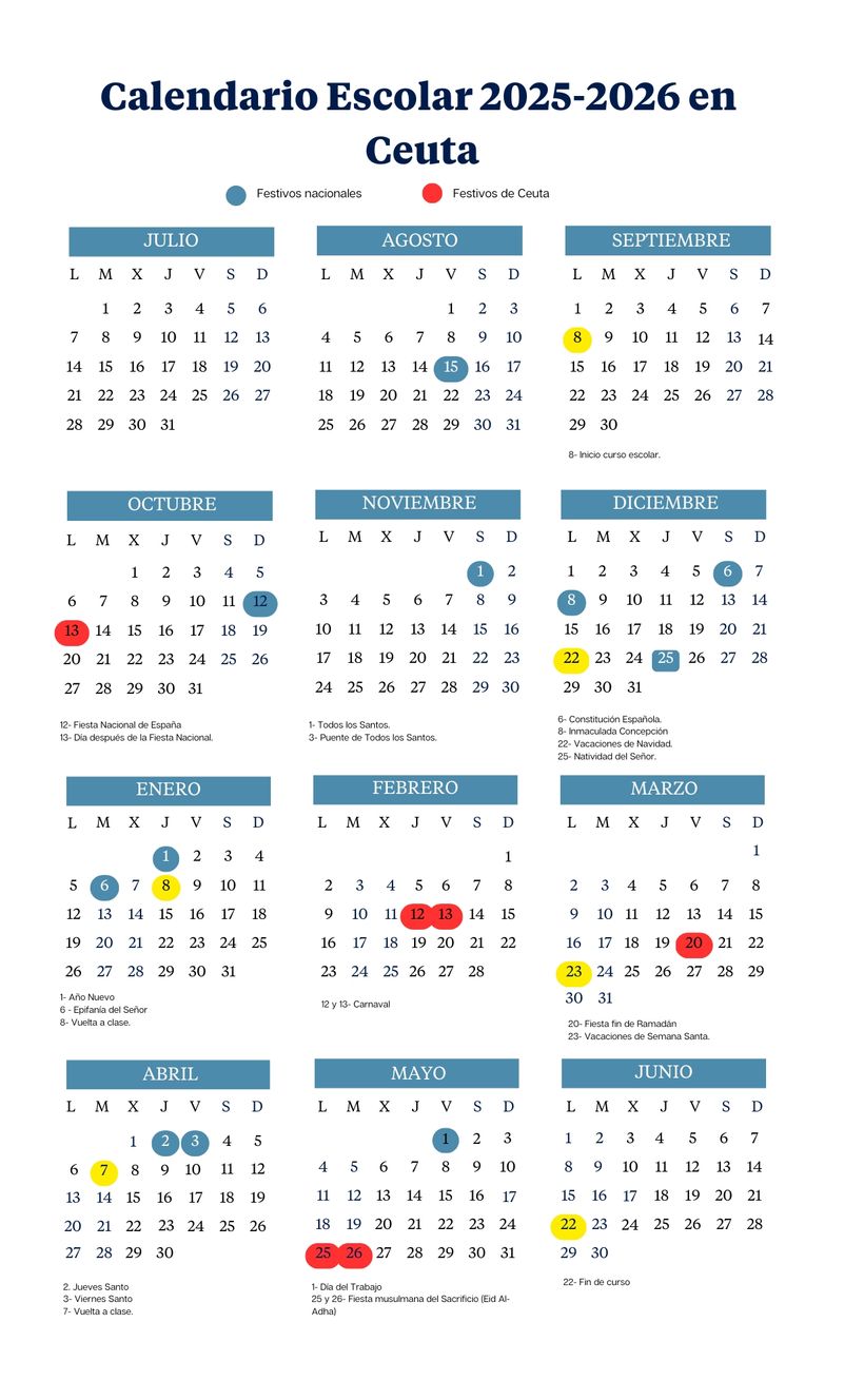El Ministerio de Educación ha publicado en su web el nuevo calendario escolar 2025-2026 en la Ciudad Autónoma de Ceuta, donde aparece indicado cuándo comienzan las clases, cuándo son las vacaciones de Navidad, qué días no habrá clase en Semana Santa o las fechas para el fin de curso.