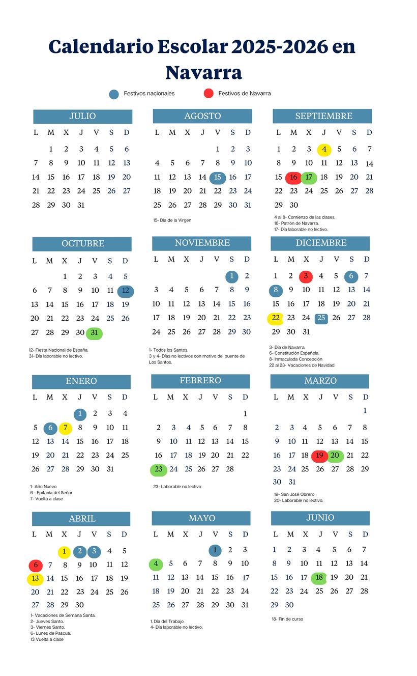 El curso escolar 2025 -2026 en Navarra comenzó de forma oficial entre los días 4 y 8 de septiembre en los niveles de Infantil, Primaria y Educación Especial, y en la ESO y Bachillerato lo hizo el 4 de septiembre. Por otro lado, las clases terminarán entre los días 17 y 19 de junio, según el ciclo en el que se encuentre matriculado el alumno, y el curso académico se cerrará el 30 de junio de 2026.
