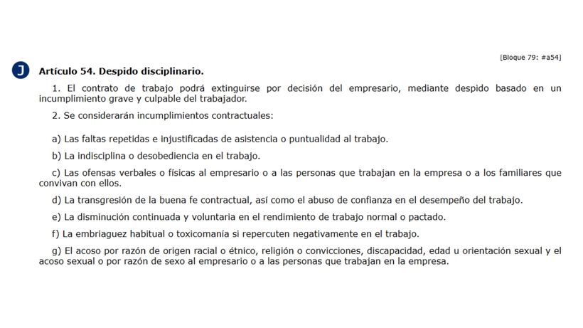 La carta reflejaba lo que señala el artículo 54 del Estatuto de los Trabajadores y los artículos número 54.3, 55.2 y 13 del convenio colectivo de grandes almacenes. La afectada intentó la conciliación administrativa presentando luego una demanda judicial en la que reclamaba la improcedencia del despido.