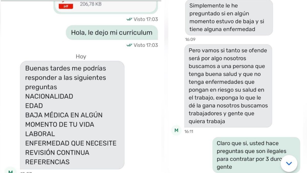 El puesto que necesitaban cubrir era el de “cocinera con experiencia” y, ya en el primer mensaje con la candidata, le pidieron que les dijera su nacionalidad, edad, si estuvo alguna vez de baja médica durante su vida laboral, si tiene alguna enfermedad “que necesite revisión continua” y referencias. Todas ilegales a excepción de la última, tal y como se explica al final.