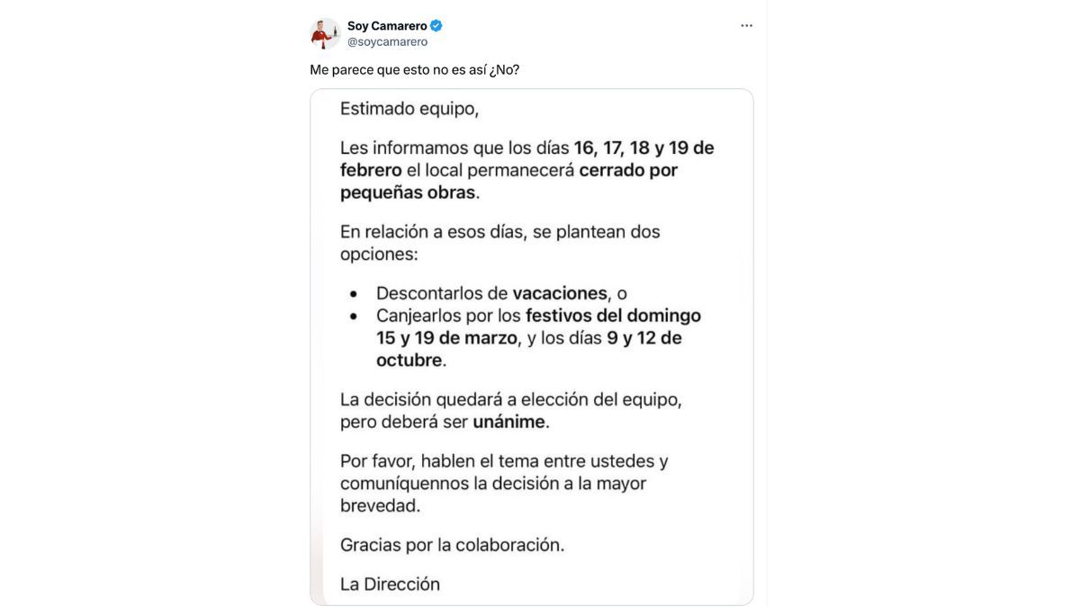 La publicación ha sido compartida en X por Jesús Soriano, conocido como Soy Camarero, uno de los principales portavoces de las condiciones laborales en la hostelería. A través de sus redes, suele denunciar prácticas empresariales que considera abusivas dentro del sector.