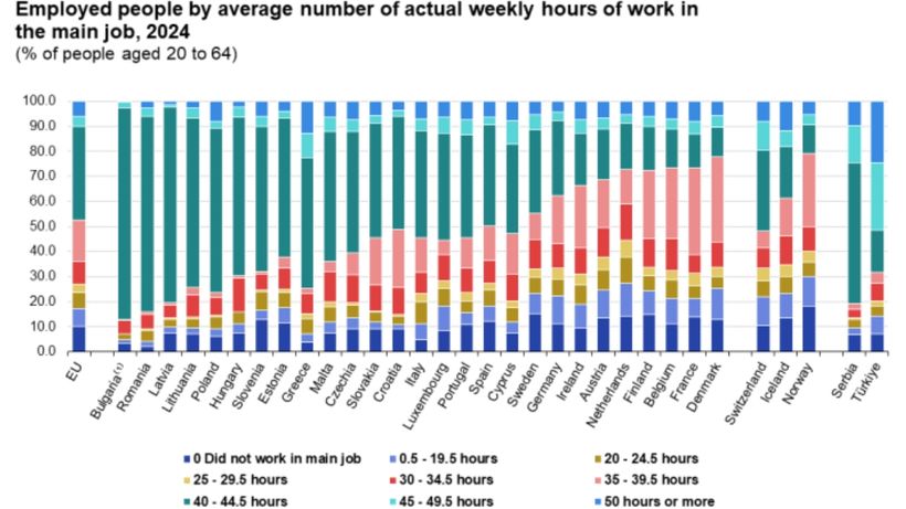 La reducción de la jornada laboral a 37,5 horas en España, impulsada por la ministra de Trabajo y Economía Social, Yolanda Díaz y las pruebas piloto que se están llevando a cabo en varios países europeos abren de nuevo el debate en torno al tiempo de trabajo. Según datos publicados por Eurostat, la jornada media en la Unión Europa para para personas con edades entre 20 y 64 euros (en 2024) era de 36 horas semanales, sumando los empleos a tiempo completo y parcial.