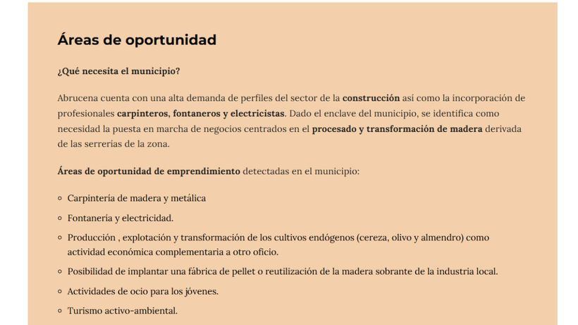 Y para eso, nada mejor que consultar las áreas de oportunidad en Abrucena. Como señala la web Holapueblo (actualizada en octubre de 2024), se necesitan carpinteros de madera y metal, fontaneros y electricistas, trabajadores para los cultivos endógenos (la cereza, el olivo y el almendro) que podría ser una actividad complementaria a otro oficio. También destaca la industria de la madera y el pellet y el turismo activo ambiental.