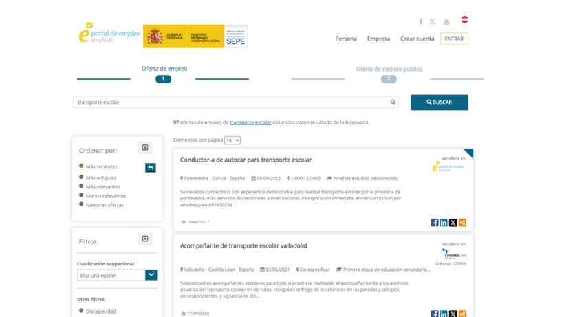 El Servicio Público de Empleo Estatal (SEPE) publica nuevas vacantes en su portal laboral ‘Empléate’ para trabajar en colegios. No se trata de maestros o personal de limpieza, sino de profesionales para acompañamiento de transporte escolar (97 ofertas de empleo), comedor (154) y extraescolares (89).