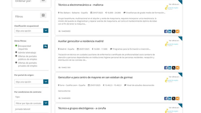 Para postular a una de las ofertas de empleo del SEPE hay que entrar en la web ‘Empléate’ y usar los filtros para marcar ‘Discapacidad requerida’ y luego, el tipo de contrato o si se requiere experiencia, estudios…