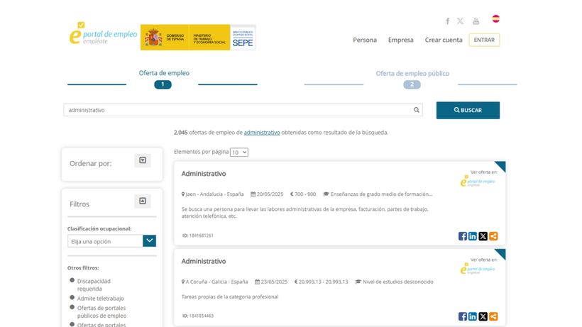 Para apuntarse a las ofertas de empleo del SEPE hay que entrar en el portal laboral ‘Empléate’ y poner ‘administrativo’ en el buscador. Luego, habrá que seleccionar la vacante en la que se esté interesado y pulsar ‘Inscribirse en esta oferta’.
