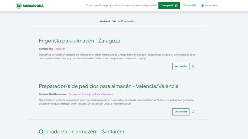 La cadena valenciana cuenta con 10 ofertas de empleo para trabajar en su sección de almacenes en varios puntos de España como Abrera, Benaguasil, Zaragoza, Almeirim o Riba-roja de Túria. Los interesados en conseguir un puesto en Mercadona podrán enviar ya el currículum a través de su nuevo portal de empleo.