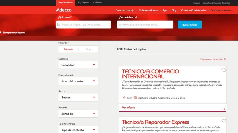 Para enviar el currículum hay que entrar en la web de Recursos Humanos Adecco, donde hay que usar la barra de búsqueda para poner ‘comercios’. Luego, pinchar en la oferta que interese y darle a ‘Solicitar’.