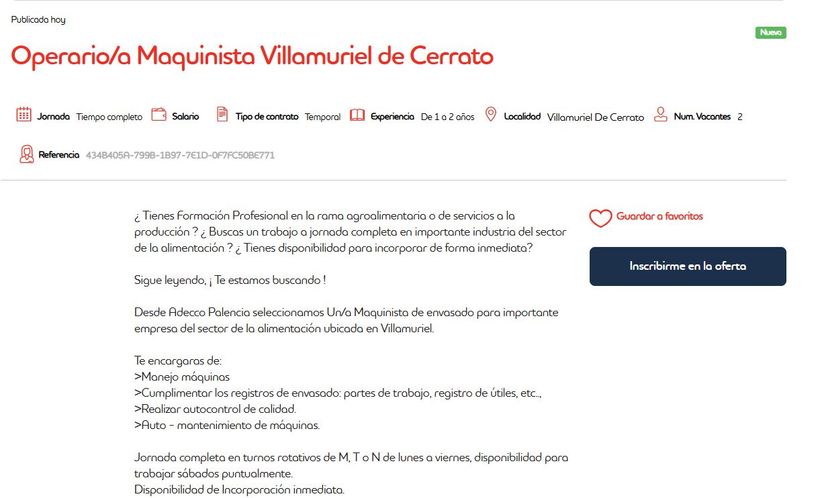 La empresa ofrece un contrato temporal a jornada completa de 40 horas semanales de lunes a viernes y en turnos de mañana/tarde, por un salario de 9,37 euros brutos la hora. Las inscripciones se realizan a través del portal de empleo de Adecco.