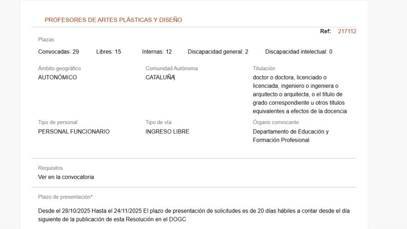 El departamento que lo convoca es el de Educación y Formación Profesional y los nuevos trabajadores serán funcionarios. El plazo está abierto hasta el día 24 de noviembre de 2025. Todos los datos ser podrá consuotar en el Portal DOGC de la Generalitat de Catalunya.