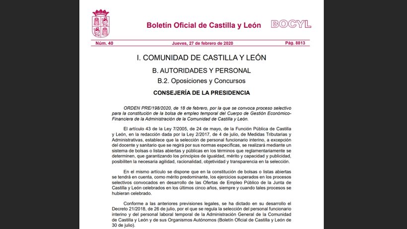 El personal que consiga una de estas vacantes será funcionario interino y para consultar las bases habrá que entrar en el Boletín Oficial de la Junta de Castilla y León (BOCyL). Ahí están publicados todos los requisitos así como el modo y lugar donde hay que enviar la solicitud.