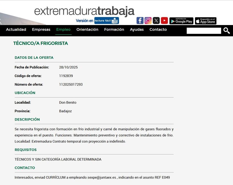 La Junta de Extremadura busca Técnico/a frigorista en Don Benito (Badajoz).