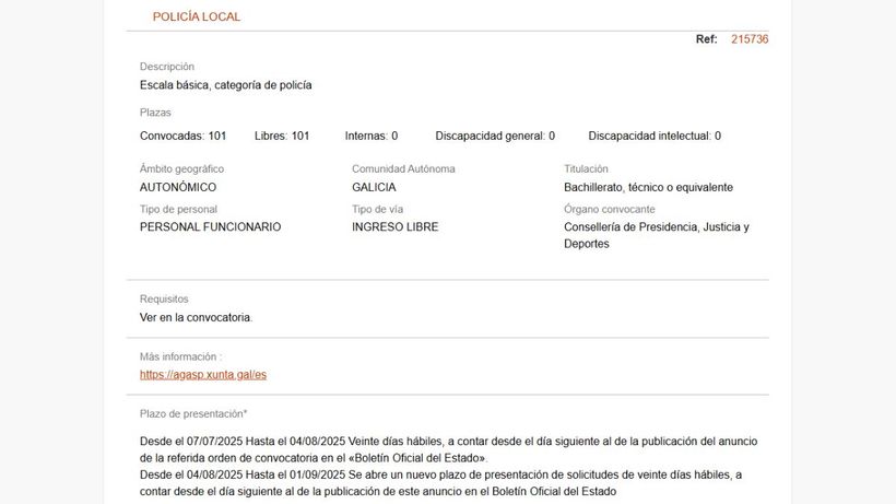 La Consellería de Presidencia, Justicia y Deportes de Galicia ha convocado 101 plazas de Policía Local para la categoría de escala básica. Todas son por acceso libre y el plazo para inscribirse termina el día 1 de septiembre de 2025.