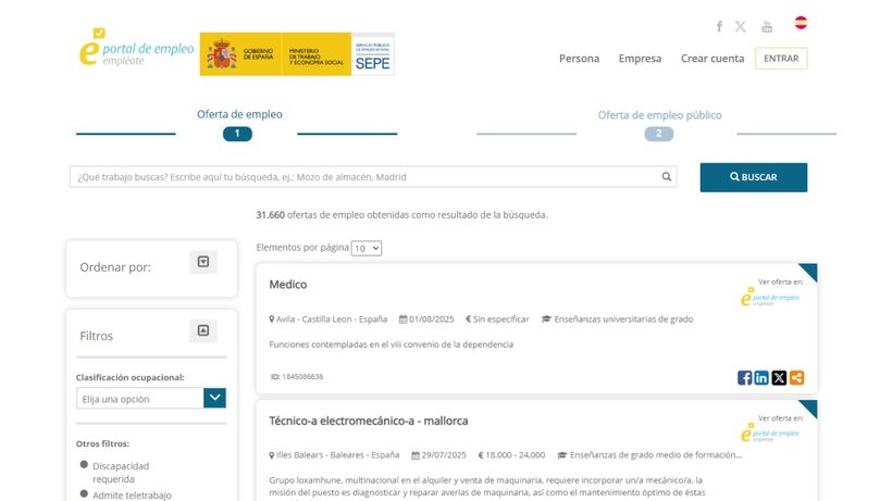 El Servicio Público de Empleo Estatal (SEPE) a través de ‘Empléate’, su portal laboral, publica 31.660 ofertas de trabajo para desempleados o trabajadores en activo que quieran cambiar de puesto o empresa. Hay oportunidades laborales en todos los sectores como la electromecánica, el cuidado de mayores en residencias o administración.