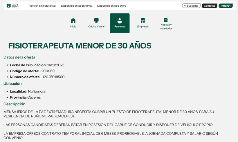 Mensajeros de la Paz Extremadura necesita cubrir un puesto de fisioterapeuta, menor de 30 años, para su residencia de nuñomoral (Cáceres).