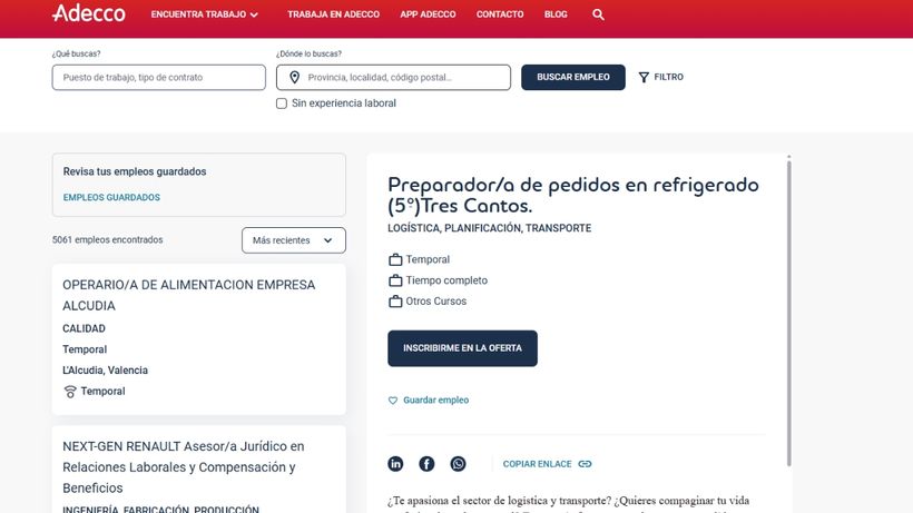 Adecco busca incorporar personal en Tres Cantos para una empresa líder del sector logístico dedicada a la alimentación. Deben ser profesionales comprometidos, con ganas de desarrollarse y trabajar en equipo. El puesto consiste en la preparación de pedidos, recepción y ubicación de mercancía en cámara frigorífica a 4ºC, realizando tareas como picking con radiofrecuencia, carga, descarga y uso de transpalet eléctrico o apilador.