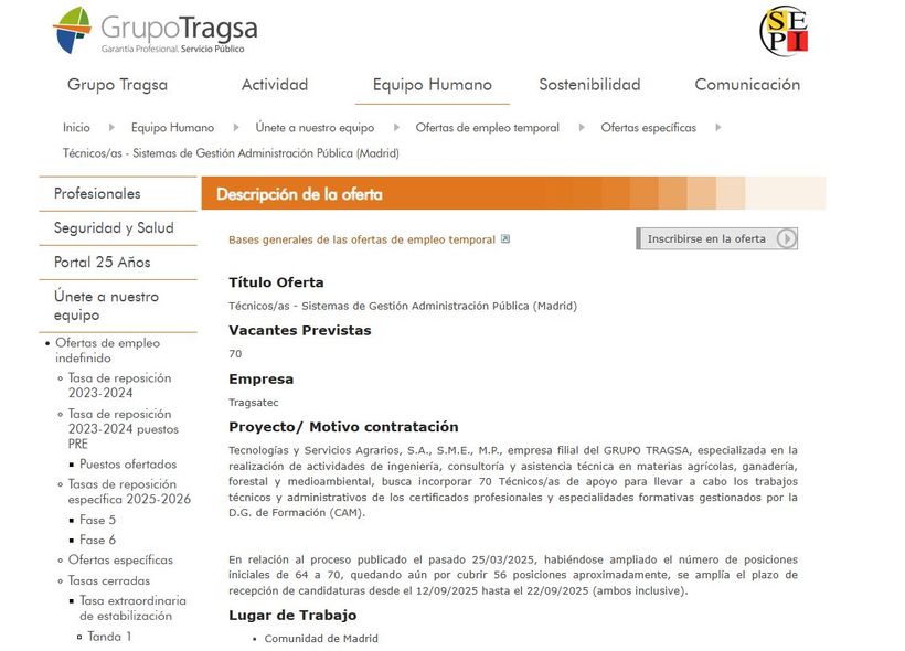 TRAGSATEC publica hasta 70 nuevas plazas de Técnicos/as Sistemas de Gestión, para trabajar en la Administración Pública de Madrid.