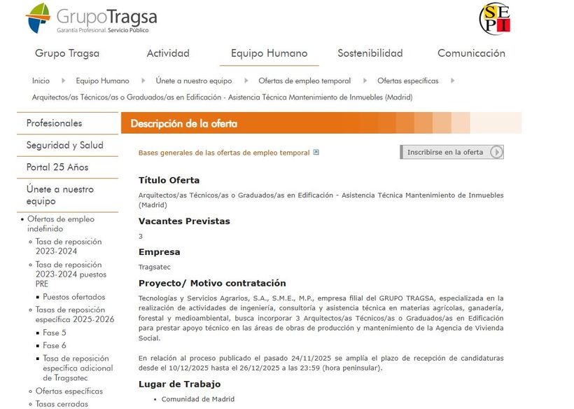 Tragsa publica nuevas plazas para Arquitectos/as Técnicos/as o Graduados/as en Edificación.