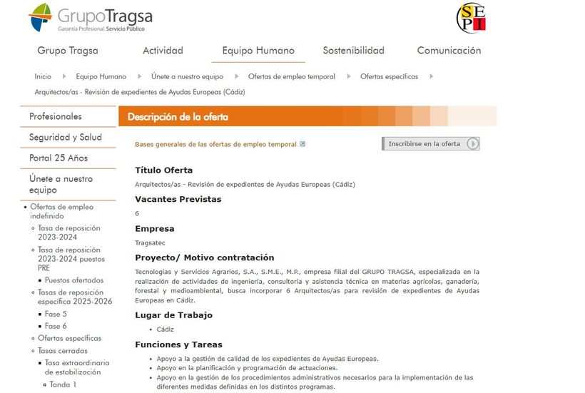 Hasta 6 nuevos puestos publica el portal Tragsa.