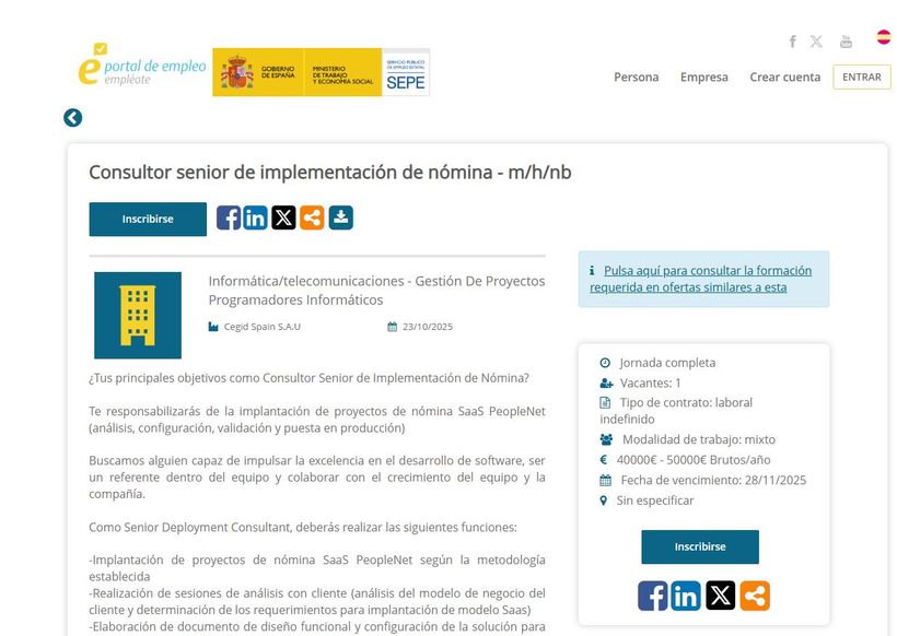 El SEPE necesita a alguien para trabajar en la implantación de proyectos de nómina SaaS PeopleNet (análisis, configuración, validación y puesta en producción).