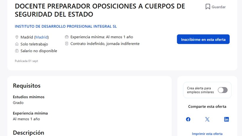 El Instituto de Desarrollo Profesional Integral SL ha publicado en Infojobs una oferta con la que busca un docente para preparar oposiciones a los cuerpos de seguridad del Estado. Piden experiencia mínima de al menos 1 año, y el contrato que ofrecen es indefinido y 100% teletrabajo.