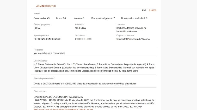 Una de las oposiciones más esperadas son las de administrativo (Grupo C1) a las que se puede acceder con el título de Bachillerato o técnico de Formación Profesional (FP). La Universidad Politécnica de Valencia ha publicado en la web de la Administración Pública del Gobierno de España una convocatoria con 49 plazas para acceder por turno libre de las que hay reservadas para personas con discapacidad.