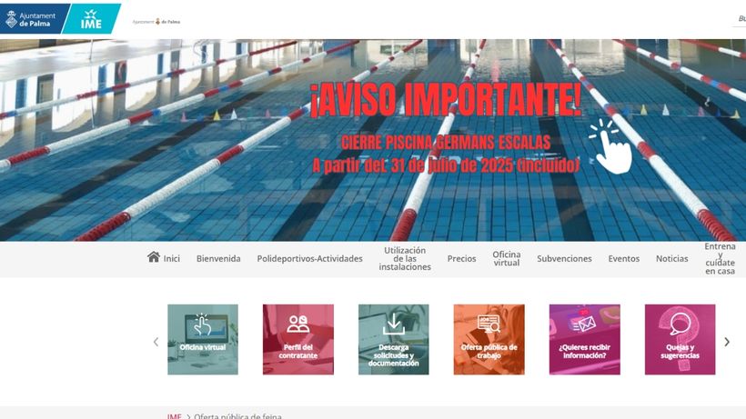 El BOE publica la convocatoria de oposiciones para personal laboral fijo en el Ayuntamiento de Palma. El puesto que deben ocupar es el de recepcionista de las instalaciones del Instituto Municipal de Deporte (IME). Piden tener el Grado en Educación Secundaria Obligatoria (ESO) y el plazo para inscribirse está abierto hasta el 28 de agosto. Para consultar todos los datos e inscribirse habrá que entrar en la web ime.pal.es, donde hay que acceder a ‘Oferta pública de feina’.