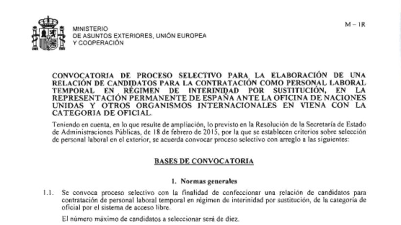 El Ministerio de Asuntos Exteriores, Unión Europea (UE) y Cooperación con representación permanente de España ante la ONU y otros organismos en Viena anuncia la apertura de una bolsa de empleo público. Las bases de la convocatoria ya aparecen en la página web de la Administración del Gobierno de España y se ofgertan puestos de personal laboral en interinidad.