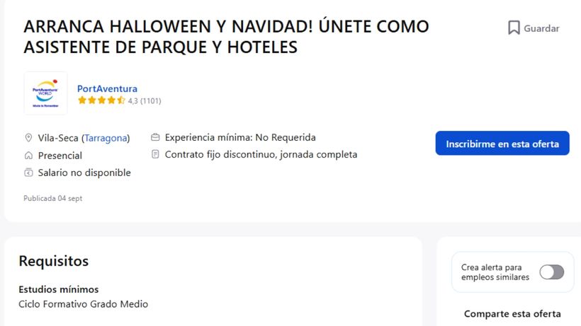Port Aventura busca personal para trabajar en la fiestas de Halloween y Navidad ocupando el cargo de asistente de hoteles. No piden experiencia previa y ofrecen un contrato fijo discontinuo a jornada completa. Los requisitos son tener ganas de trabajar, se valora la experencia en puestos de atención al cliente y saber hablar idiomas, formación mixta o superior y motivación.