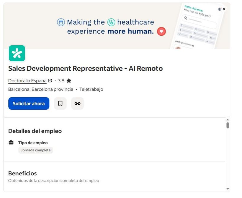 Se abre proceso de selección para contratar a un Sales Development Representative – AI remoto en Doctoralia España.