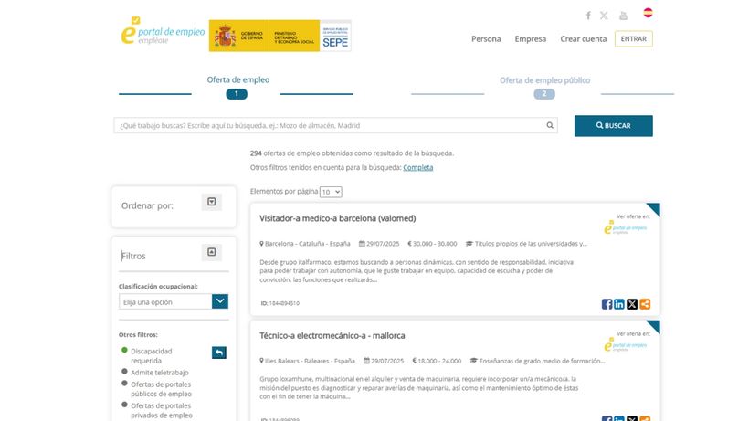 El Servicio Público de Empleo Estatal (SEPE) por medio de su portal ‘Empléate’ lanza 294 ofertas de trabajo de distintas empresas. Necesitan profesionales con discapacidad acreditada del 33% o superior, y ofrece contrato indefinido. Algunas de las vacantes son: