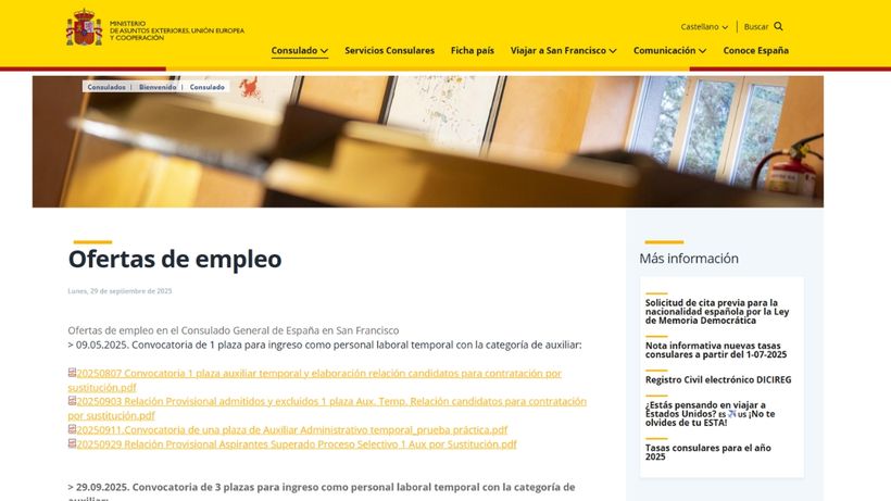 El Ministerio de Asuntos Exteriores, Unión Europea y Cooperación ha publicado en el BOE 3 plazas para auxiliares administrativos en el Consulado General de España en San Francisco (Estados Unidos). Para acceder es necesario tener el Graduado en Educación Secundaria Obligatoria o equivalente.
