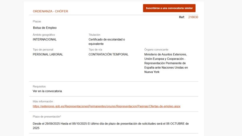 El Ministerio de Asuntos Exteriores, Unión Europea y Cooperación abren una bolsa de empleo público para la Representación Permanente de España ante Naciones Unidas en Nueva York. Para acceder a uno de estos puestos habrá que presentar el certificado de escolaridad o equivalente, y los nuevos trabajadores tendrán la categoría de personal laboral con contratación temporal.