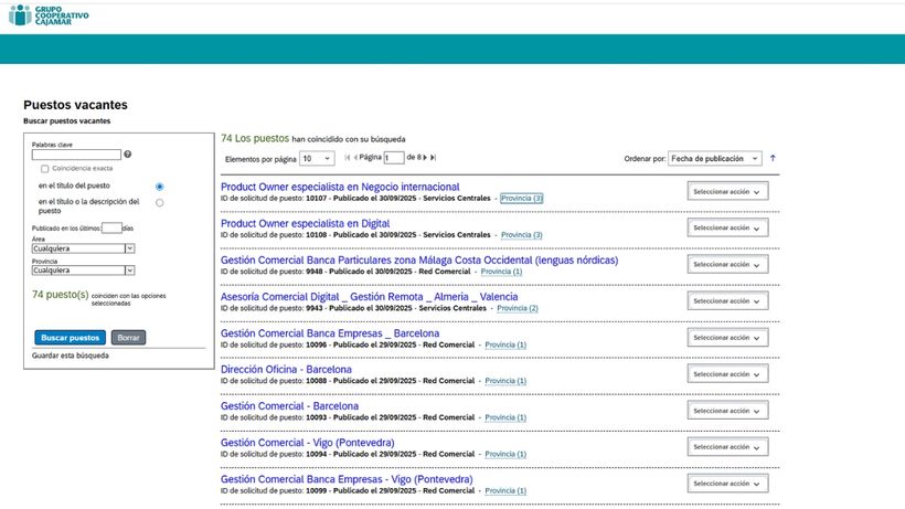 Cajamar tiene activas 74 nuevas ofertas de empleo en sus oficinas y necesitan trabajadores para todos los departamentos como el de informática, atención al cliente e incluso para los puestos directivos. Aunque este es el número de oportunidades laborales, puede ser que en alguna haya más de una vacante.