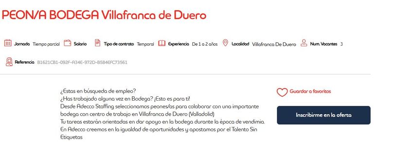 Pasando a los requisitos, piden tener el título de Educación Secundaria Obligatoria, experiencia de un año, experiencia en el sector vinícola o, en su defecto, en el sector industrial, y contar con vehículo propio para llegar al centro de trabajo. En caso de estar interesado/a, el CV se debe enviar mediante el portal laboral de Randstad.