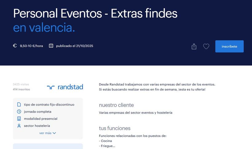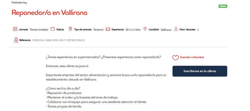El puesto cuenta con contrato indefinido, una jornada semanal de 37,5 horas y dos posibles turnos: de mañana (10:00 a 17:30) o de tarde (11:30 a 19:00). La retribución es de 8,614 euros brutos por hora, con incorporación prevista para el 17 de noviembre de 2025.
