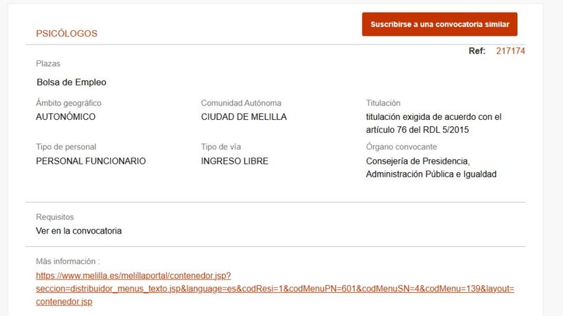 El BOE publica una oferta de empleo público para psicólogos en la Ciudad Autónoma de Melilla, y para acceder es necesario presentar la titulación que aparece en el artículo 76 del RDL 5/2015 donde se regula el Estatuto Básico del Empleado Público.