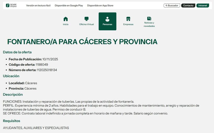 El SEXPE (El Servicio de Empleo de la Junta de Extremadura) necesita cubrir un perfil de fontanero/a para instalación y reparación de tuberías en Cáceres y provincia.