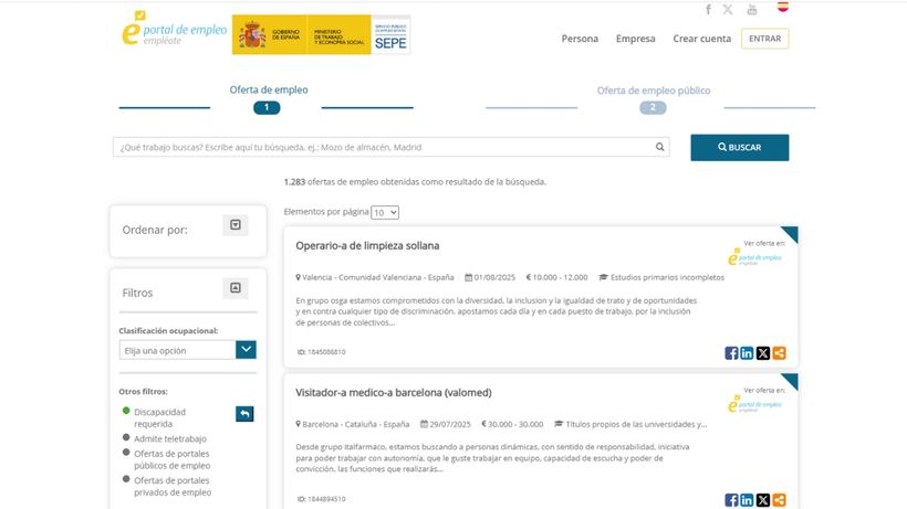 Para apuntarse a una de estas ofertas de trabajo hay que entrar en el portal del SEPE ‘Empléate’ y seleccionar el filtro ‘Discapacidad requerida’.