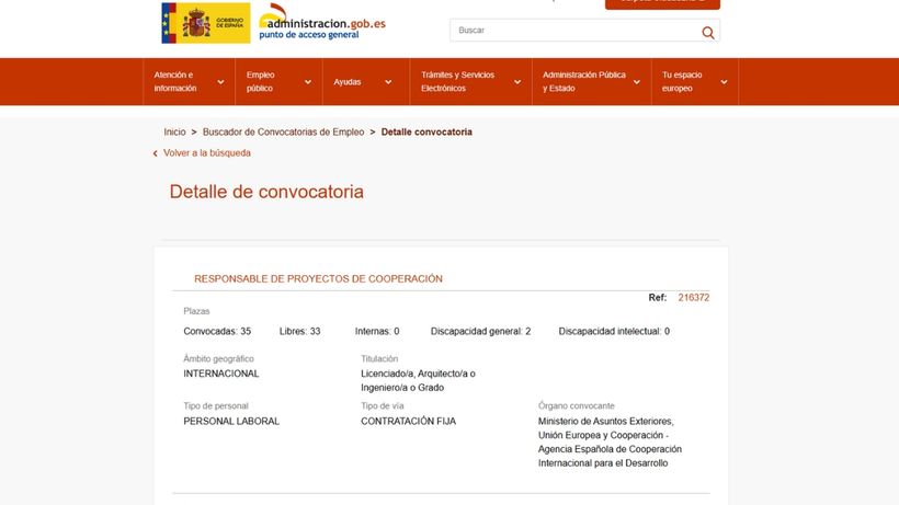 El Ministerio de Asuntos Exteriores, Unión Europea y Cooperación, por medio de la Agencia Estatal de Cooperación Internacional para el Desarrollo, ha publicado en el BOE las bases de una convocatoria de oposiciones con 35 plazas de responsables de proyectos de cooperación. Los nuevos empleados públicos tendrán la categoría de personal laboral fijo y para acceder a estos puestos se pide una licenciatura o Grado Universitario.