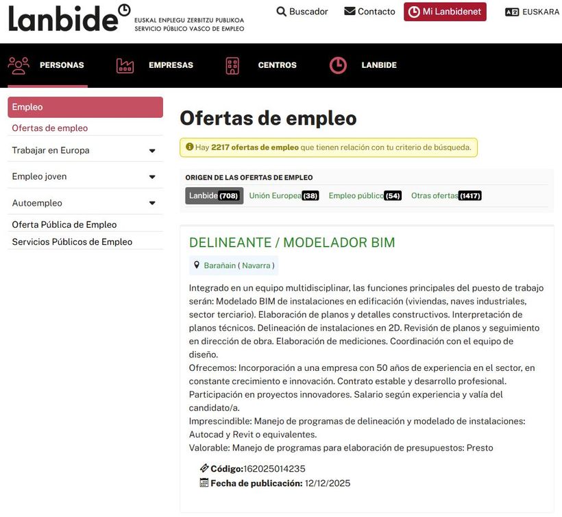 El Servicio Público Vasco de Empleo publica una oferta de DELINEANTE / MODELADOR BIM.