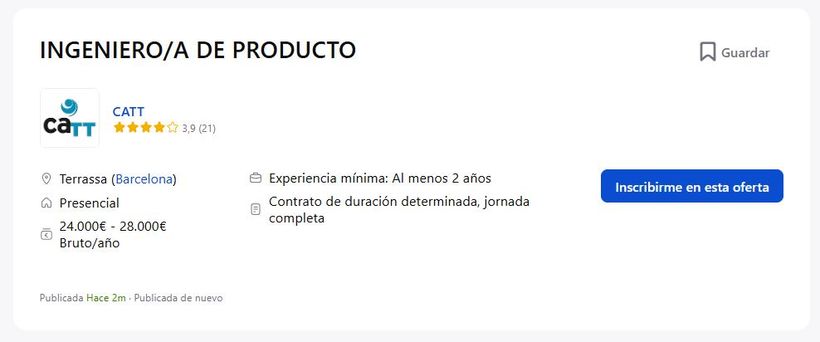 La empresa CATT contrata a una persona en Terrassa (Barcelona).