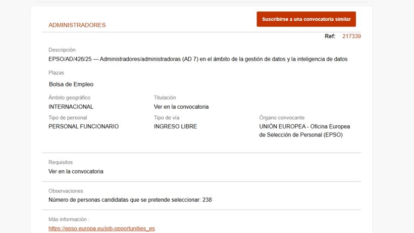 La Unión Europea, por medio de la Oficina Europea de Selección de Personal (EPSO) ha abierto una bolsa de empleo público para personal administrador (AD7) en el ámbito de la gestión de datos y la inteligencia de datos. El ingerso es libre y cuando se consiga uno de los puestos será como personal funcionario interino.